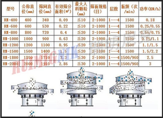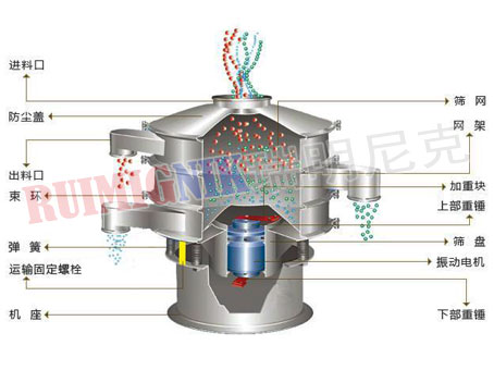 RM1200-1S特氟龙旋振筛系列三次元旋振筛,由直立式电机作激振源,电机上、下两端安装有偏心重锤,将电机的旋转运动转变为水平、垂直、倾斜的三次元运动,再把这个运动传递给筛面。调节上、下两端的相位角,可以改变物料在筛面上的运动轨迹。